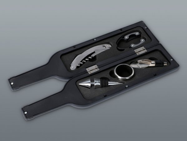 Praktičen paket orodja za vinarja v lepem dizajnu v obliki vinske steklenice.