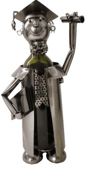 Kovinsko, ročno izdelano stojalo za steklenice s prostornino 0,75 l. Na stojalu je upodobljen študent - diplomant, absolvent.